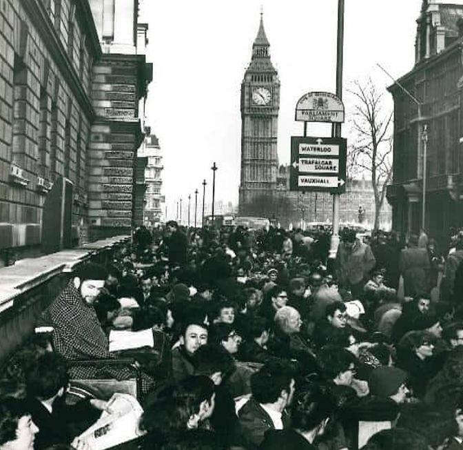 The Committee’s first action was a sit-down outside the Ministry of Defence in Whitehall in February 1961. They gathered 2,000 pledges to join the civil disobedience, and a still greater number took part, with hundreds more demonstrating nearby. Reflecting hesitation in Harold Macmillan’s Tory government over firm action, no arrests were made. A second sit-down in Parliament Square in April saw a change in tactics by the authorities, with over 800 people arrested and charged with obstruction of the highway and breach of the peace.