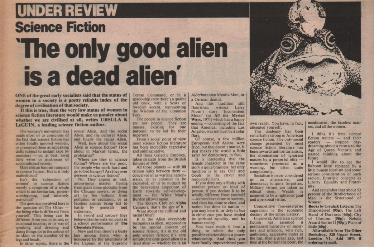 It is the Alien everybody recognises as alien, supposed to be the special concern of science fiction; it’s in the old pulp science fiction; it’s very simple: the only good alien is a dead alien – whether he is an Alderbaranian Mantis-Man, or a German dentist.