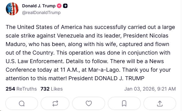 Trump announced this morning that US forces have captured Nicolás Maduro and his wife. “Flown out of the Country,” he wrote. A press conference at Mar-a-Lago at 11 a.m. Details to follow. Thank you for your attention to this matter.